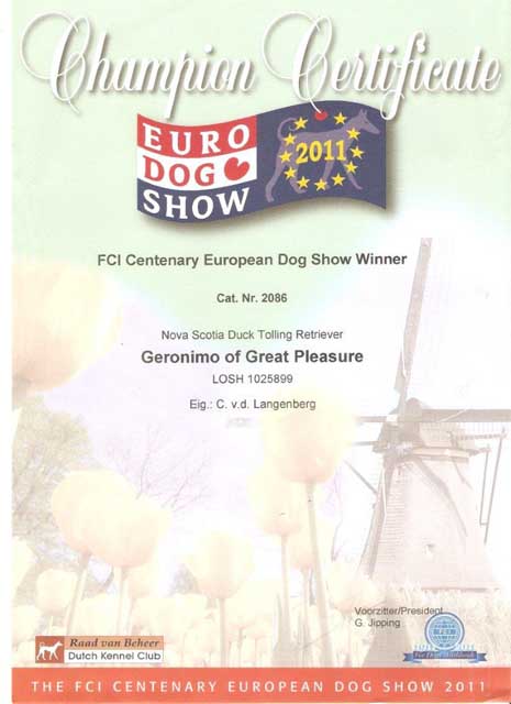 Geronimo of Great Pleasure (Germo) werd in Goes BOB en daarmee definitief Nederlands Kampioen. Op de eindkeuring werd hij ook nog 4de in de rasgroep. Op dezelfde show behaalde Hukleberry of Great Pleasure (Finn), zijn derde jeugd CAC en werd daarmee Nederlands Jeugdkampioen. |